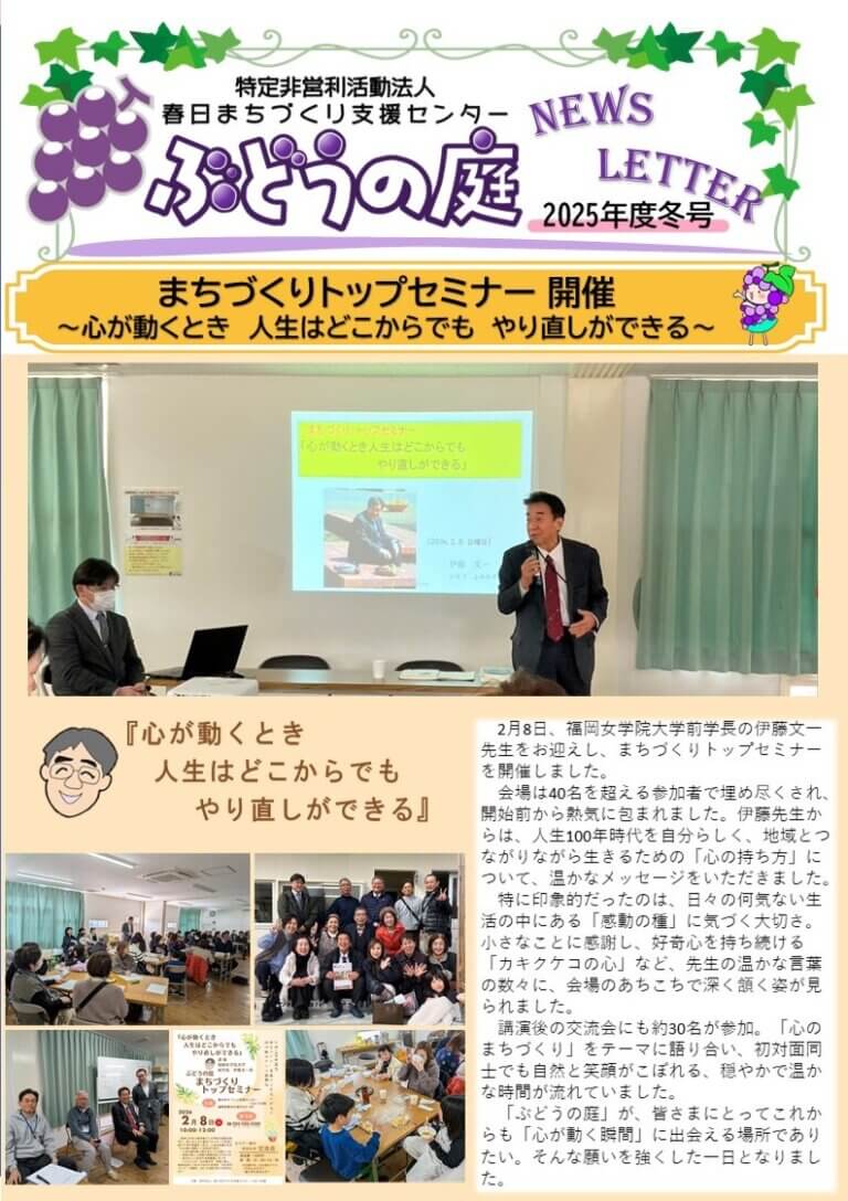 「特定非営利法人春日まちづくり支援センター・ぶどうの庭」は、まちづくりに係わる皆さんの市民活動を支援することを目的としたNPO法人です。