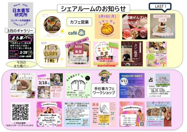 2月のシェアルームカレンダーと会員活動&イベント予定です。 みなさまのお越しをお待ちしております。
