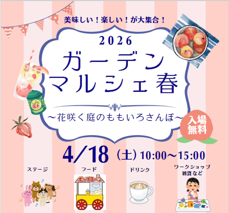 「2026 ガーデンマルシェ春~花咲く庭のももいろさんぽ~」開催決定! 日時:2026年4月18日(土)10:00~15:00(少雨決行・荒天中止) 場所:春日まちづくり支援センター・ぶどうの庭 楽し […]