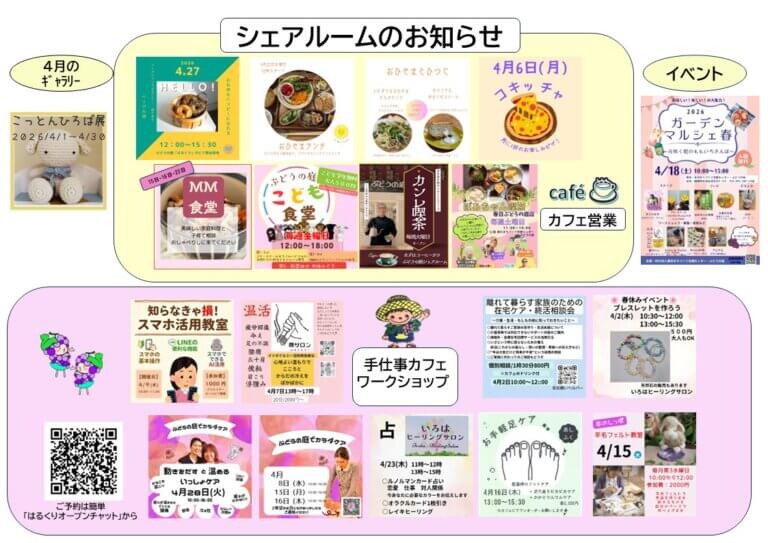 4月のシェアルームカレンダーと会員活動&イベント予定です。 皆様のご利用をお待ちしております。