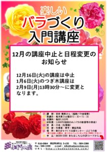 12月バラ講座 中止と日程変更のお知らせ 2025年12月6日2025年12月6日お知らせ 12月のバラ講座は講師の都合により中止になりました。 また、1/6(火)に予定していました接ぎ木講座は、2/9(月)13時30分~に変更となりましたので お間違えの無いようよろしくお願い致します。